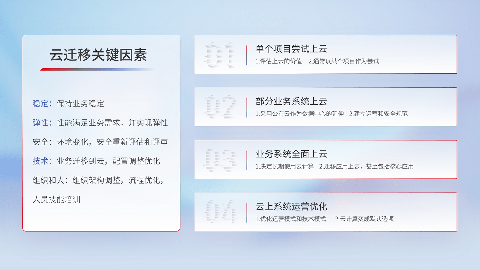 结合实际业务,,,从规划设计、、、、云平台选型、、云原生改造、、、数据迁移、、、集成交付,,,迁移全过程为客户识别最佳上云路径,,,,做好风险识别管理,,设计网络架构、、、、身份权限、、、安全审计合规、、、、操作审计、、、日志审计、、、、监控告警策略、、、、多站点容灾设计等,,,对云上基础设施进行整体规划,,,,提升IT治理水平,,,以满足弹性、、高可用、、、、高性能的需求。。。。
